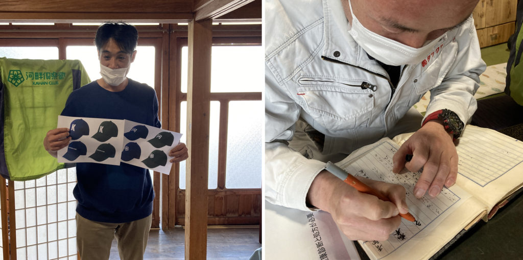 また、河畔倶楽部の活動時にかぶるキャップを新しく作ろうという話があり、デザインをみんなで決めました、夏でも通気性の良いメッシュのキャップを作ります。